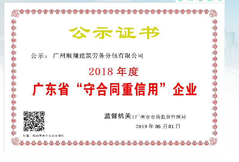 祝贺公司旗下的劳务公司——广州顺翔建筑劳务分包有限公司首次荣获广东省“守合同重信用”企业荣誉称号。