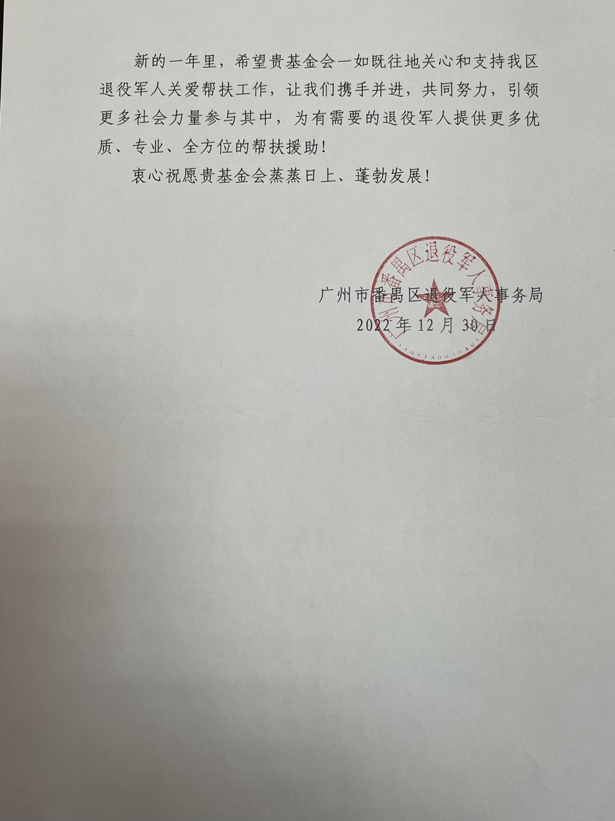 番禺区退役军人事务局向平凡慈善基金会赠匾致信