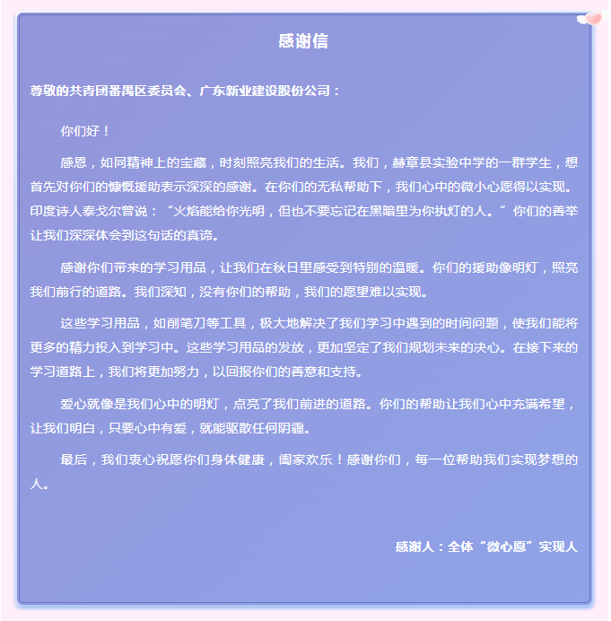 在过去的2023年里,远在贵州毕节的赫章县实验中学里有一群风华正茂的莘莘学子,他们在老师的带领下,通过“微心愿”的活动向社会展示了他们内心小小的梦想和期望。我司在共青团番禺区委员会的宣传下知晓了这项活动,本着企业发展、反哺社会的企业初心和弘扬社会正能量的企业使命,在共青团番禺区委员会的组织及带领下,我司积极参与到此项活动中,希望通过企业的绵薄之力能够帮助这群远方的孩子可以实现心中的梦想和期望,愿他们在人生的道路上迎风破浪,勇往直前,向着梦想的彼岸进发!