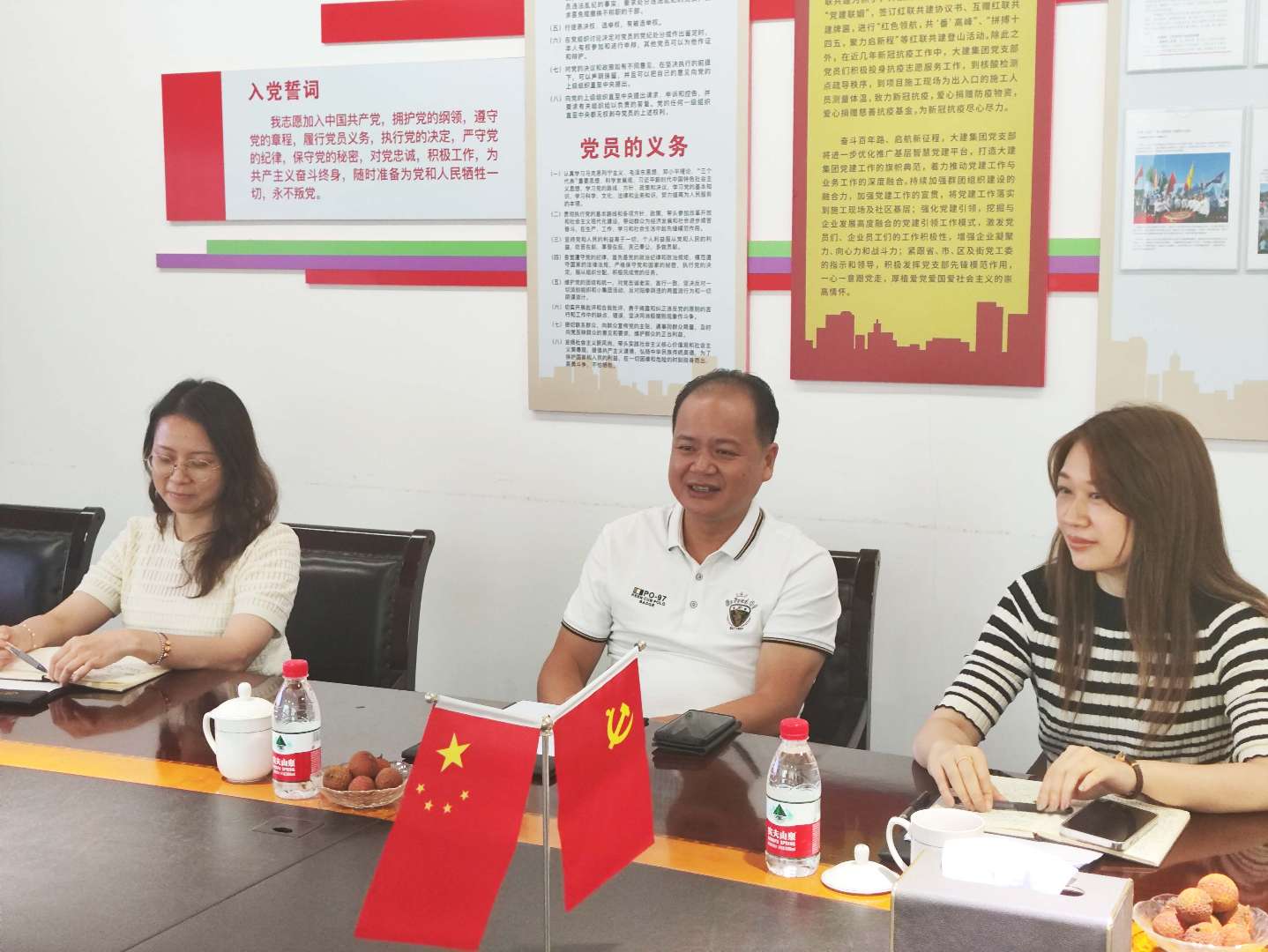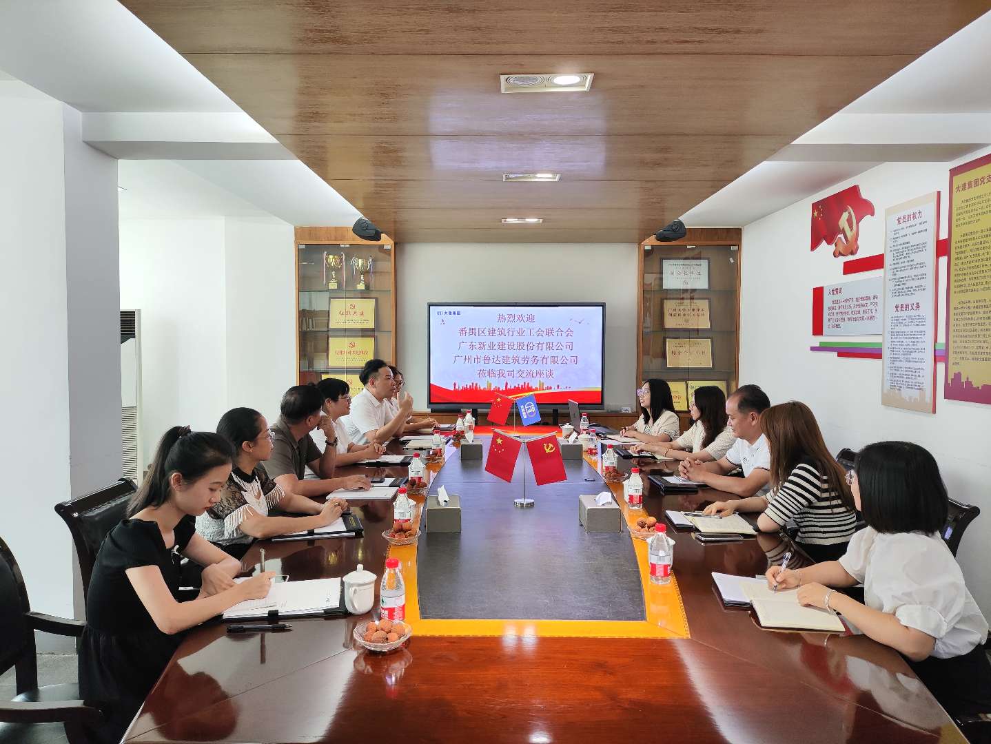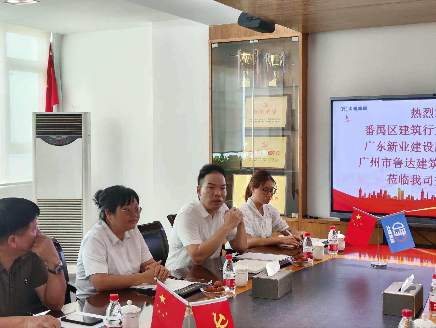 7月2日下午,在番禺区建筑行业工会联合会主席蔡瑞南的组织下,我司副总经理容文雄,党支部副书记陈剑兰、工会主席严雪霞联同广州市鲁达建筑劳务有限公司办公室主任郭倩瑶共同到大建集团进行交流。大建集团总经理梁坤胜、副总经理毛晓云带领团队热情接待。