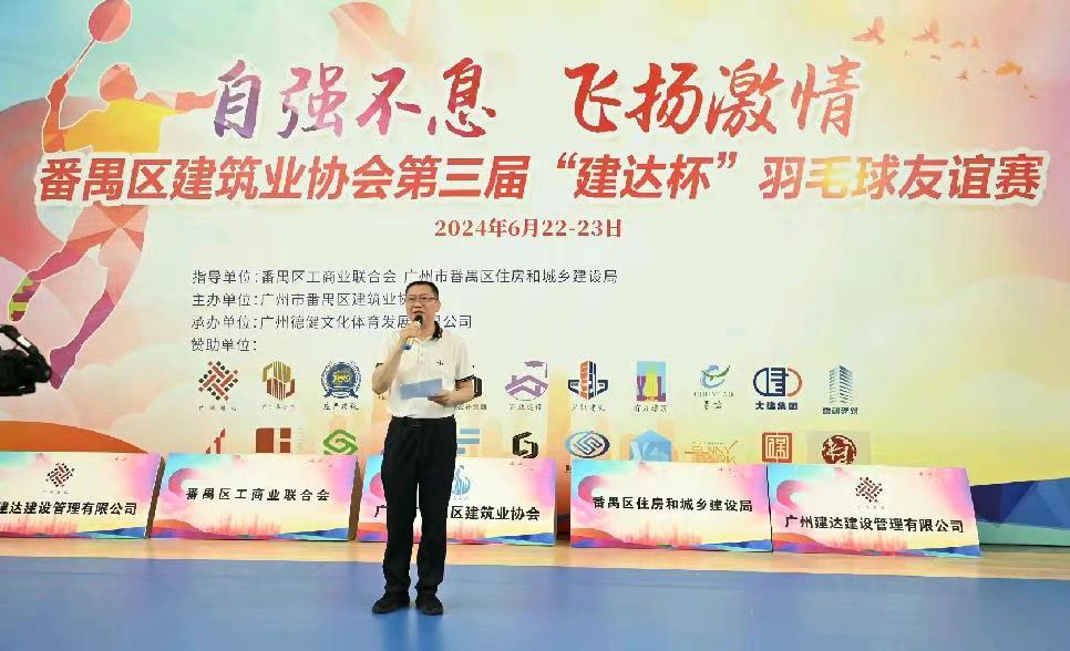 6月22日上午,由番禺区建筑业协会主办的2024年第三届“建达杯”羽毛球友谊赛在市桥街道大生潮玩馆-羽毛球馆拉开帷幕。区统战部副部长、工商联党组书记岑镜洪,区住建局党组书记陈舜展、副局长庞伟聪,区建筑业协会会长蒲建峰参加了开幕仪式。